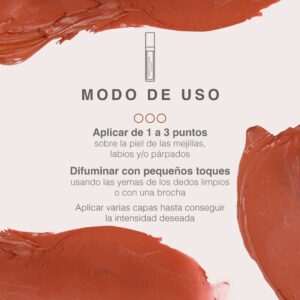Aplicar de 1 a 3 puntos sobre la piel de las mejillas, labios y/o párpados. Difuminar con pequeños toques usando las yemas de los dedos limpios o con una brocha. Aplicar varias capas hasta conseguir la intensidad deseada.