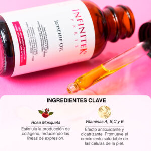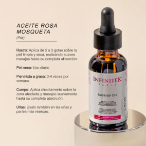 Me encanta el aceite de rosa mosqueta por su pureza y olor sutil, sufría de acné y tenía muchas manchas que desde que uso los productos de Infinitek han mejorado visiblemente