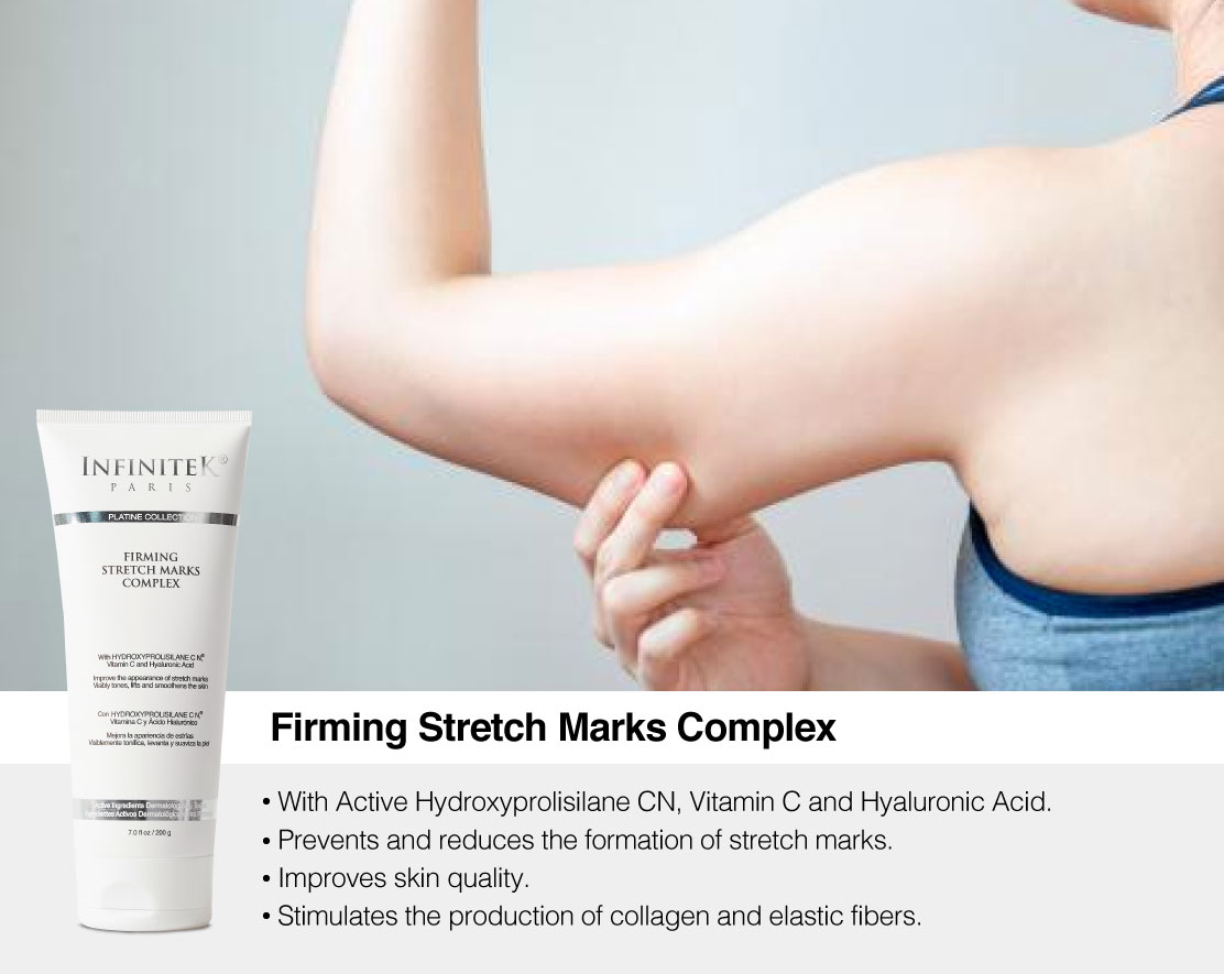 It is common to see that, due to the distension of the tissues, the skin feels flaccid and without firmness. Apply a product that offers you hydration, increases the production of collagen and elastic fibers such as our firming Anti-Stretch Marks Complex that tones, firms, lifts and smoothes the skin. Consume large amounts of water that will keep your body hydrated and thus avoid tissue dehydration.