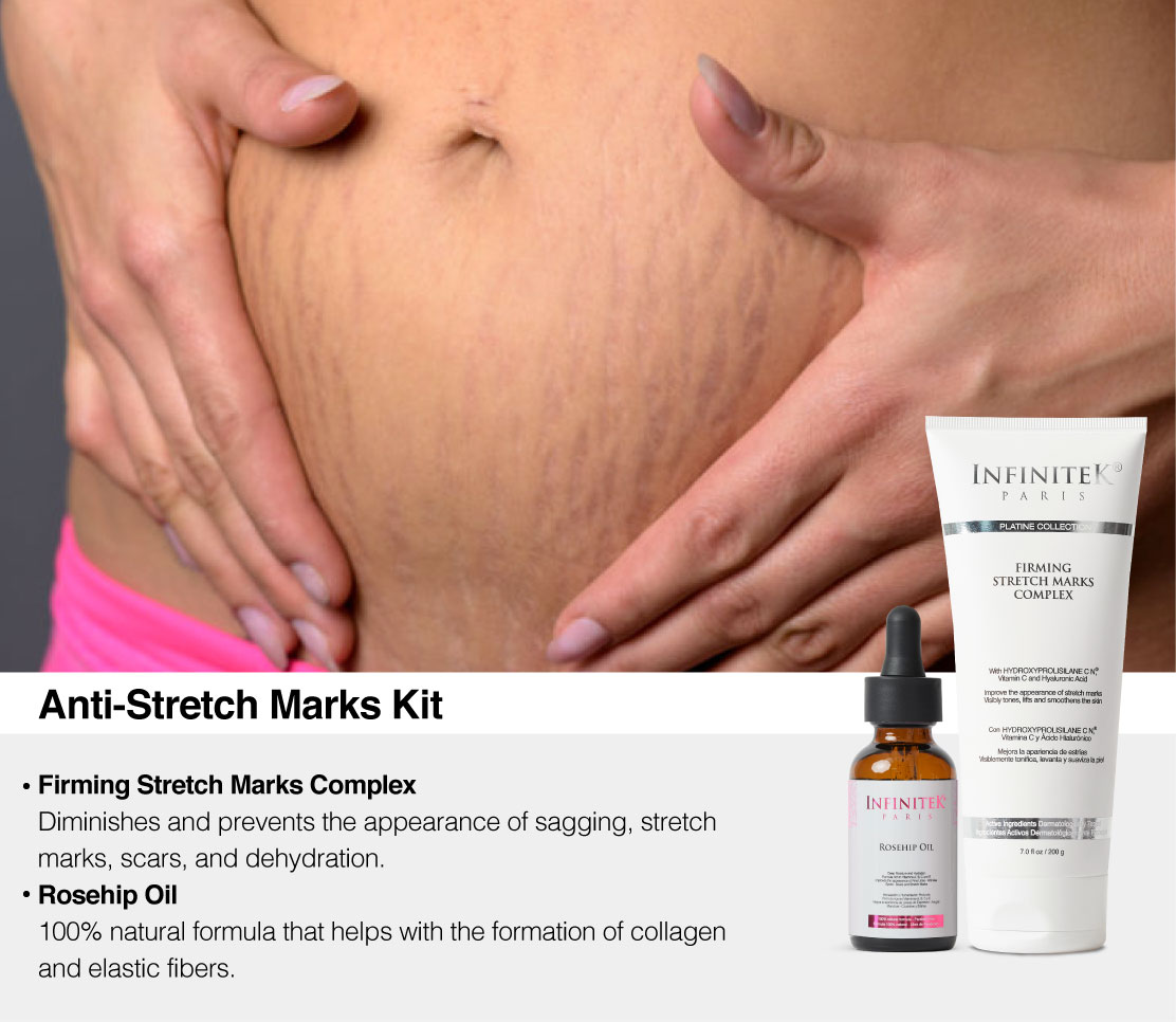 Stretch marks normally appear on the breasts, abdomen, legs and buttocks, they occur due to the distension of the skin that suffers with the gestation process, it is important to give your skin ingredients that nourish, hydrate and repair your skin such as our Kit Anti -Stretch marks containing: Firming Anti-Stretch Marks Complex and Rosa Mosqueta Oil, together improve the appearance of stretch marks, flaccidity and dehydrated skin, helping the formation of collagen and elastic fibers; while regenerating and repairing dry and sensitive skin.