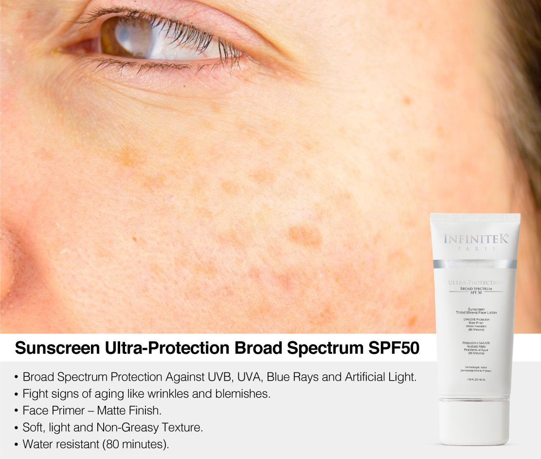 The most important thing is the application of sunscreen daily, especially on parts exposed to the sun such as the face and neck. Apply every 2 to 3 hours to minimize pregnancy spots that can persist even after giving birth. Our Ultra-Protection SPF 50 Sunscreen is a 100% mineral formula, contains broad-spectrum protection that will protect you against UVA, UVA, blue light and artificial light.