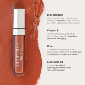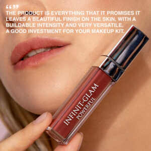 Our INFINIT-GLAM POWERFUL is a creamy blush for lips, cheeks, and eyes. Its exclusive multi-functional pigmented formula provides a radiant and youthful tone to the lips and skin. The texture is soft and light with a matte, velvety finish. The application is buildable, allowing you to achieve anything from a natural to a deeper tone. The more layers you apply, the deeper and more durable the color intensity will be. It can be mixed with other colors to achieve the desired tone. Contains natural pigments and Bixa Orellana extract, which helps maintain the natural beauty of the skin, leaving it firm, hydrated, and youthful.
